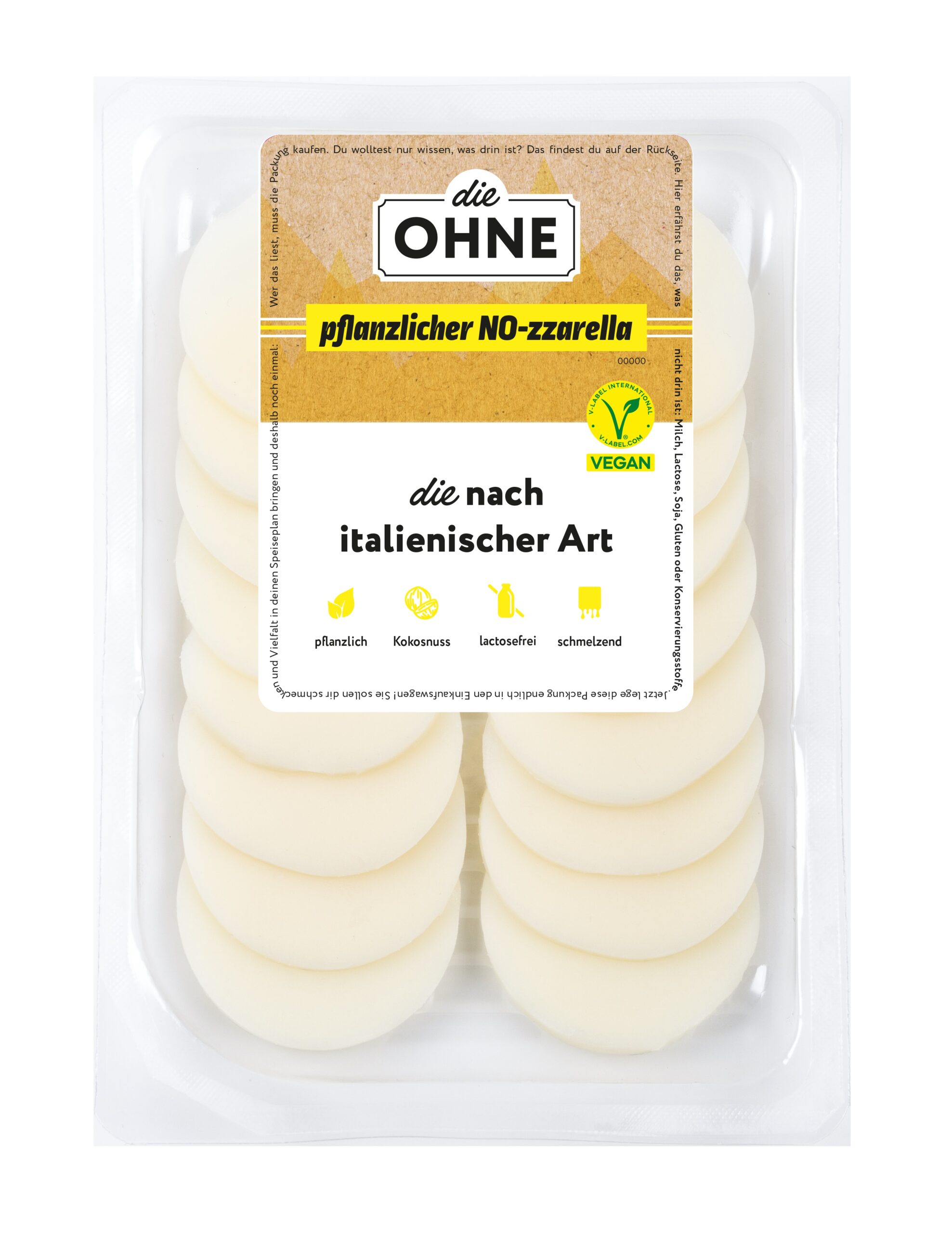 Den pflanzlichen „die OHNE“ NO-zzarella gibt es am Stück mit 175g und demnächst für die Selbstbedienungstheke geschnitten in Scheiben mit 150g.