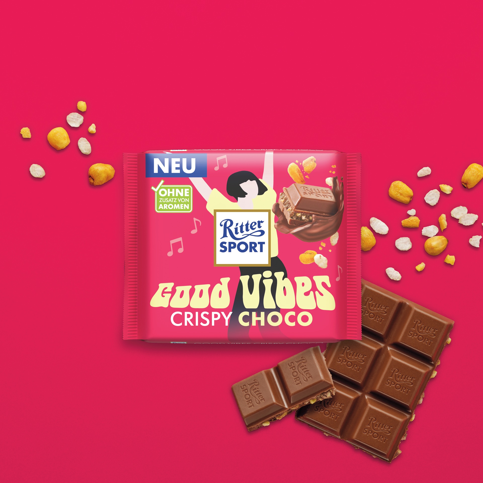 Die RITTER SPORT Good Vibes Crispy Choco ist neu im Sortiment und sorgt für den perfekten Crunch ab dem ersten Bissen. Zarte RITTER SPORT Vollmilchschokolade trifft auf eine Füllung aus Kakaocreme, gerösteten Mais-Stückchen und Reisflakes – und sorgt schon beim Knicken für Good Vibes.